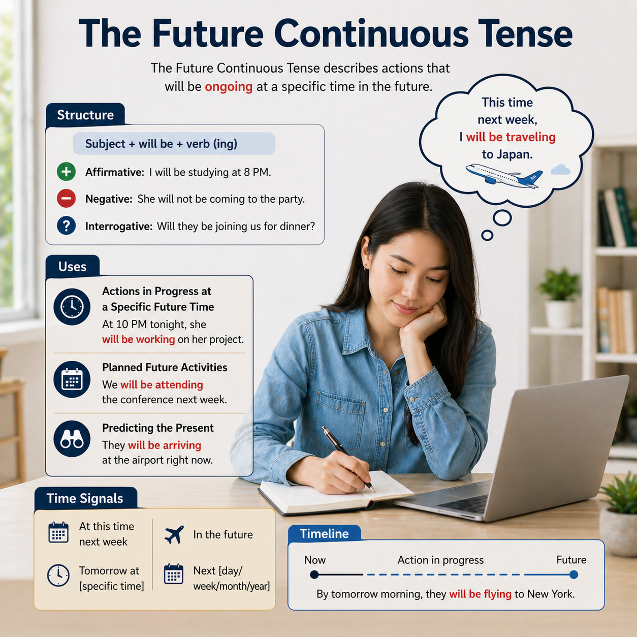The Future Continuous Tense is an essential aspect of English grammar that allows speakers to describe actions that will be ongoing at a specific point in the future. This tense is particularly useful for expressing future activities that are planned or expected to occur over a duration of time.