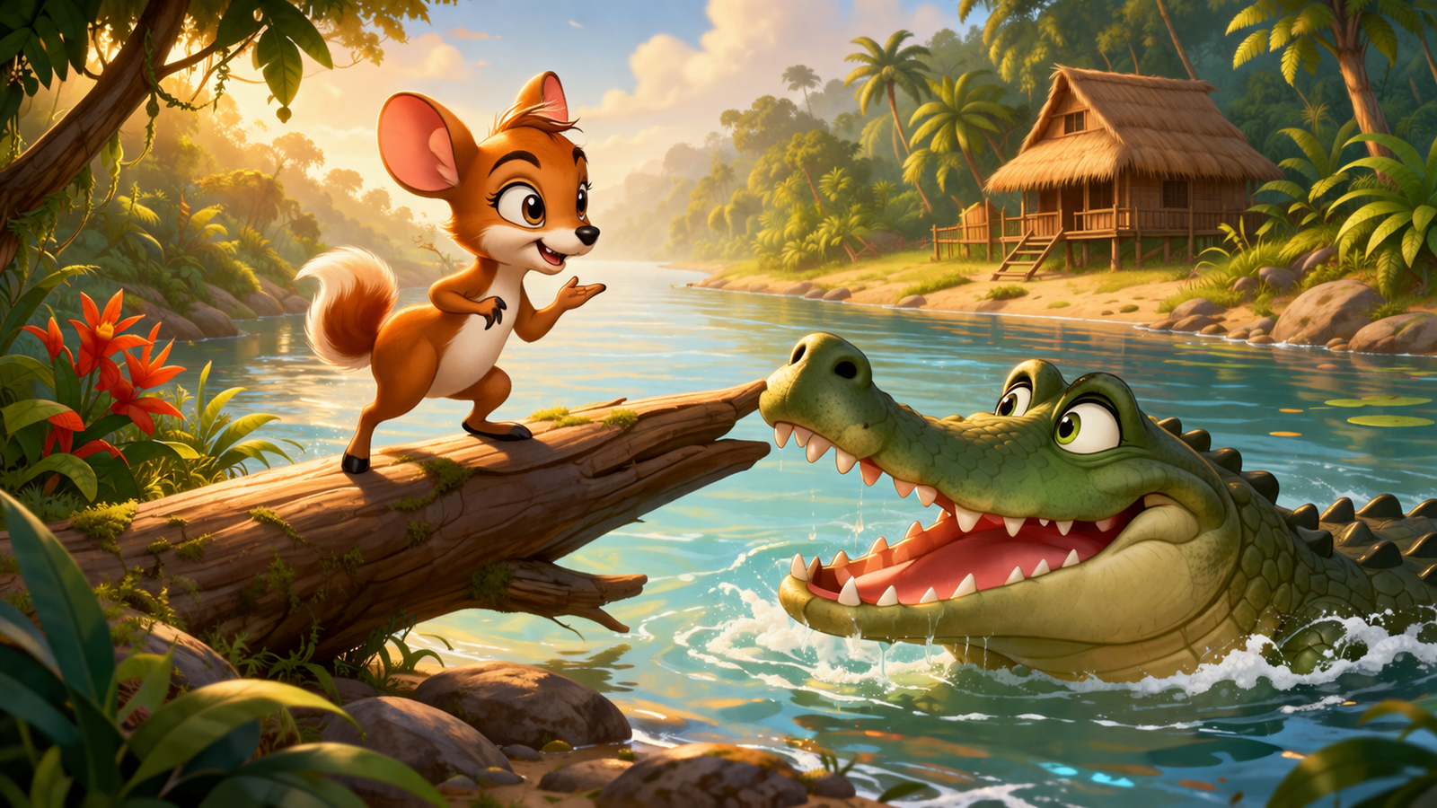 Then Si Kancil asked them to line up across the river so he could count them easily. One by one, the crocodiles formed a long line from one side to the other. Si Kancil stepped carefully onto their backs, counting aloud as he moved forward. The crocodiles remained still, believing that they were taking part in an important task.