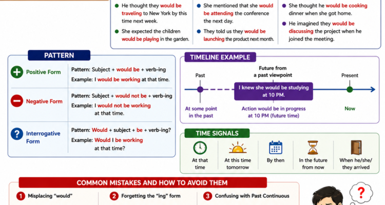 Learn the past future continuous tense with clear explanations, practical examples, and common mistakes to help you describe ongoing actions in the future from a past perspective with confidence.