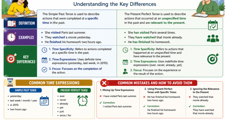 Learn the difference between simple past and present perfect with clear explanations, easy examples, and common mistakes to improve your grammar accuracy.
